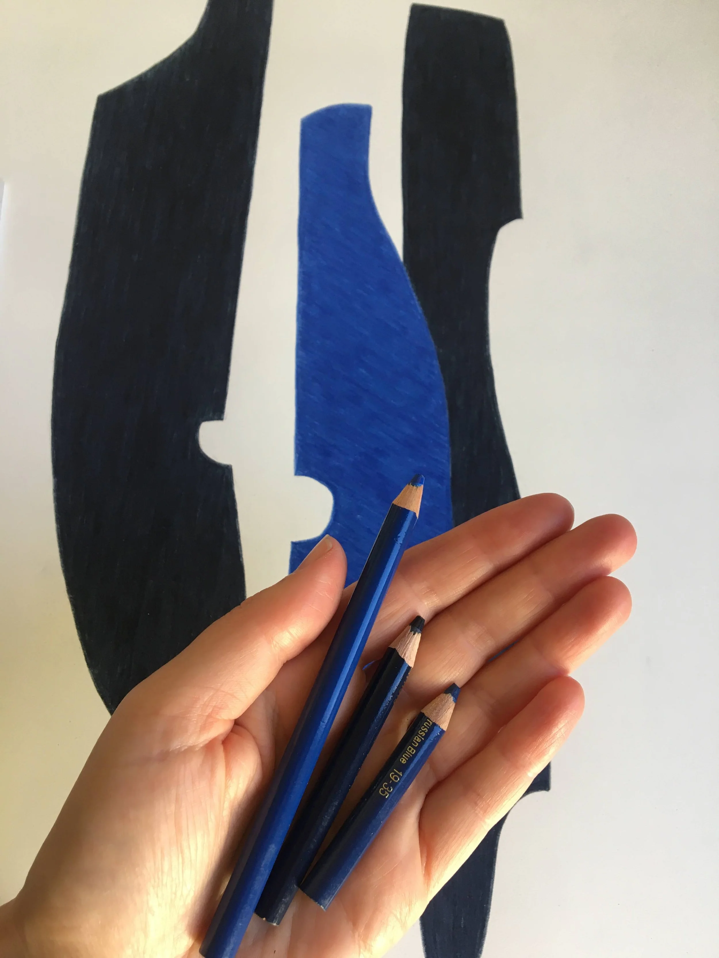 Hendry's drawings also reveal the direct work of the artist's hand. The mark making is evident with each stroke, clean line and edge visible in her pencil drawings. The depth of colour in the works is built up by layering pencil marks to create density of pigment. These colour works are often paired with meticulously fine line work which is achieved through using handheld rulers and a sharpened graphite pencil.