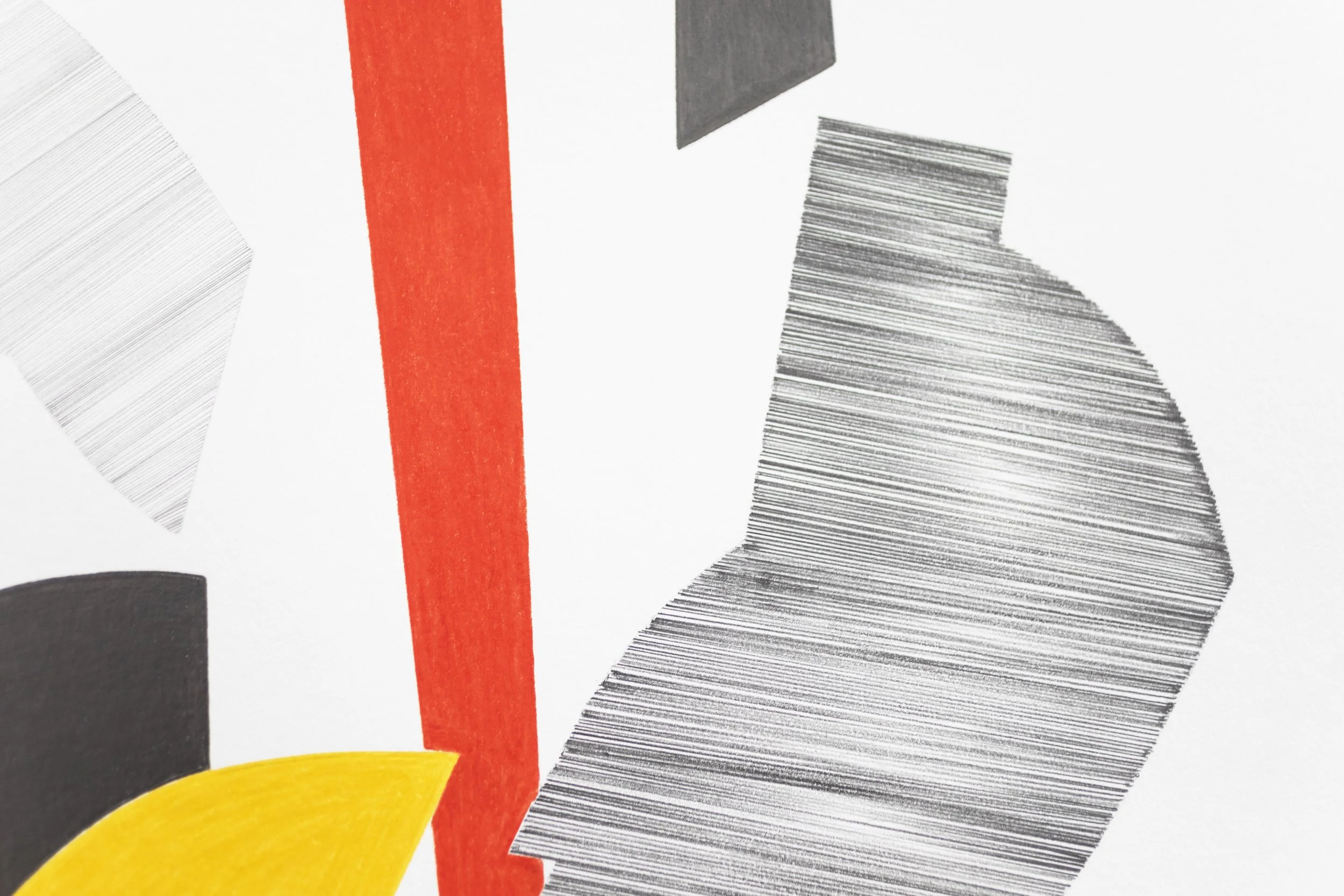 Hendry works in coloured and graphite pencil to develop detailed abstractions that play with line, colour, shape and form. Her drawings create a visual hum through the layering and density of colour and the repetition of fine lines.